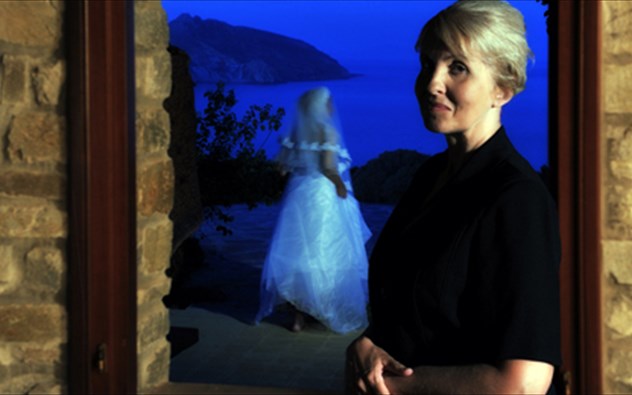 Την Ελένη Ζιώγα συνοδεύει στο ταξίδι της παράστασης η πανέμορφη οπτασία, ντυμένη νύφη, Μυρτώ Καρέκου.