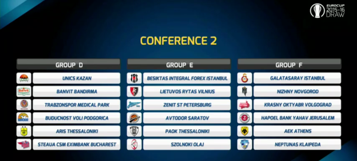 Η ΑΕΚ, που μάλλον έχει το δυσκολότερο έργο, είναι στον 6ο όμιλο με Γαλατάσαραϊ (Τουρκία), Νίζνι (Ρωσία), Κράσνι Οκτιάμπρ (Ρωσία), Χάποελ Ιερουσαλήμ (Ισραήλ), ΑΕΚ (Ελλάδα) και Νεπτούνας (Λιθουανία).