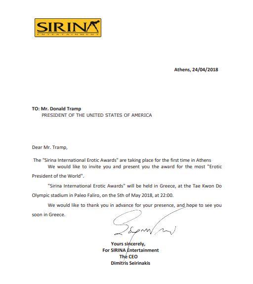 Επίσημη πρόσκληση έστειλε ο Δημήτρης Σειρηνάκης στον Αμερικανό πρόεδρο, Ντόναλντ Τραμπ για τα Όσκαρ της βιομηχανίας του πορνό που θα απονεμηθούν για πρώτη φορά...