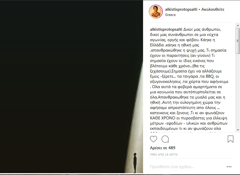 Η Άλκηστις Πρωτοψάλτη εξέφρασε δημόσια την οργή τους, αλλά και τον πόνο τους για τους πληγέντες από τις φωτιές ...