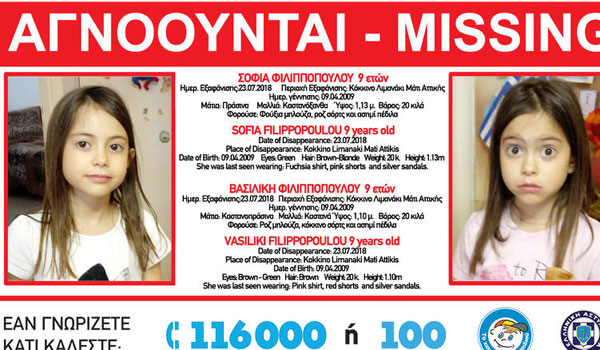 Aγωνία για τα δίδυμα κοριτσάκια Σοφία Φιλιπποπούλου 9 ετών και Βασιλική Φιλιπποπούλου, 9 ετών που αγνοούνται από το Κόκκινο Λιμάνάκι, στο Μάτι Αττικής.
