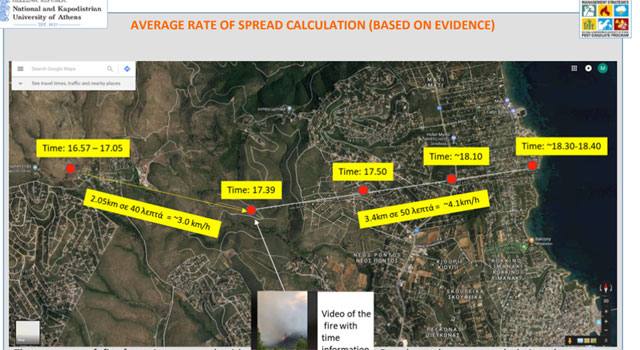 «Η ταχύτατη εξάπλωση της φωτιάς συντέλεσε σημαντικά στην ελαχιστοποίηση του διαθέσιμου χρόνου αντίδρασης, γεγονός που συντέλεσε στο μεγάλο αριθμό των θυμάτων. Με βάση μαρτυρίες που αναλύονται συστηματικά, προκύπτει ότι ο πληθυσμός που βρισκόταν κοντά στην παραλία, τουλάχιστον σε ορισμένες θέσεις, έλαβε πληροφόρηση για το γεγονός ότι η πυρκαγιά προσεγγίζει την ακτή, όχι με τη μορφή έγκαιρης προειδοποίησης από κάποιο φορέα, αλλά από άτομα που εκκένωναν το δυτικότερο κομμάτι του οικισμού Μάτι. Το γεγονός αυτό δείχνει ότι ο πληθυσμός είχε στη διάθεσή του σχεδόν μηδενικό χρόνο μεταξύ συνειδητοποίησης του κινδύνου και απόφασης αντίδρασης».