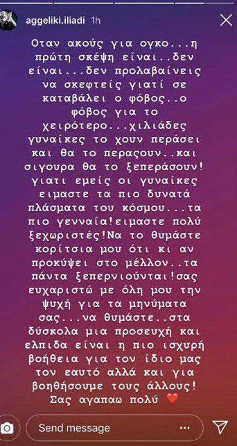 Σας ευχαριστώ με όλη μου την ψυχή για τα μηνύματά σας. Να θυμάστε στα δύσκολα μια προσευχή και ελπίδα είναι η πιο ισχυρή βοήθεια για τον ίδιο μας τον εαυτό αλλά και για να βοηθήσουμε τους άλλους. Σας αγαπώ πολύ».