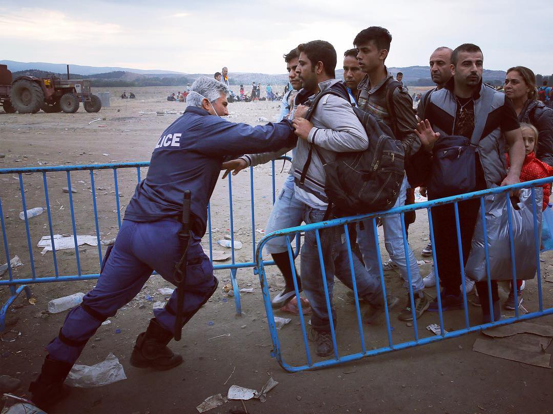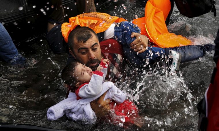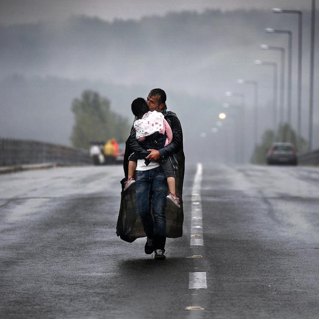 Πρόσφυγας πατέρας από τη Συρία, που κρατάει σφιχτά στην αγκαλιά του την κόρη του και την φιλά, πλησιάζει τα ελληνικά σύνορα