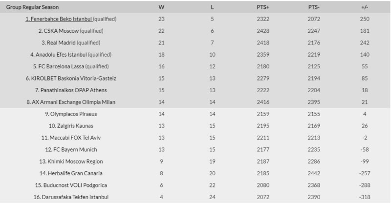 Η κατάταξη της Euroleague