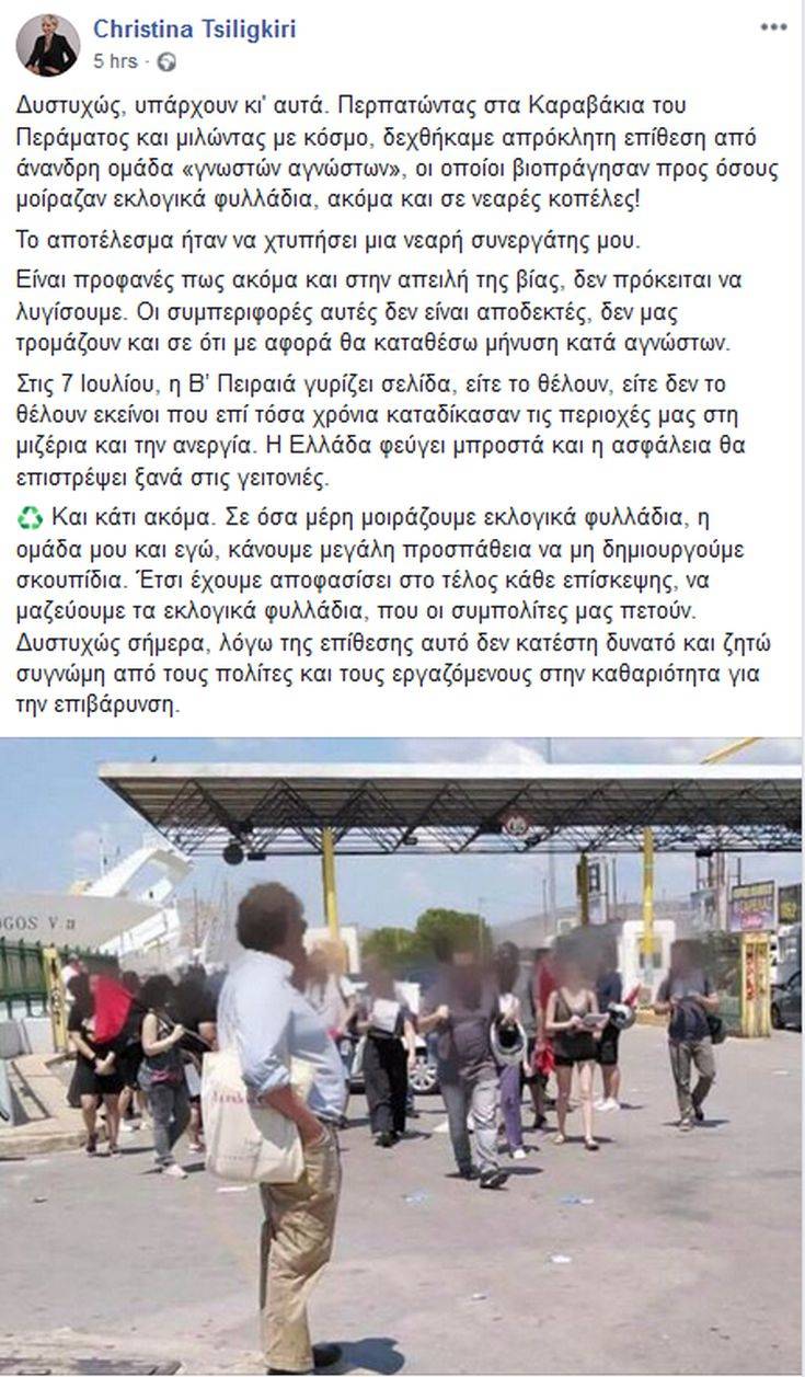 Η ίδια έγραψε μεταξύ άλλων στο Facebook ότι «Περπατώντας στα Καραβάκια του Περάματος και μιλώντας με κόσμο, δεχθήκαμε απρόκλητη επίθεση από άνανδρη ομάδα “γνωστών αγνώστων”, οι οποίοι βιαιοπράγησαν προς όσους μοίραζαν εκλογικά φυλλάδια, ακόμα και σε νεαρές κοπέλες!»
