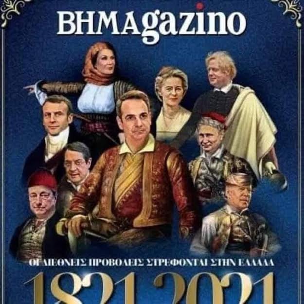 Στο εξώφυλλο, που είναι ενταγμένο στο πνεύμα της 25ης Μαρτίου, τα πρόσωπα γνωστών πολιτικών προστέθηκαν στις εικόνες ηρώων της επανάστασης του 1821: ο Κυριάκος Μητσοτάκης εμφανίζεται ως στρατηγός Μακρυγιάννης, η Γιάννα Αγγελοπούλου ως Μπουμπουλίνα, η Ούρσουλα φον ντερ Λάιεν ως Μαντώ Μαυρογένους, ο Μπόρις Τζόνσον ως λόρδος Μπάιρον, ο Εμανουέλ Μακρόν «ντύνεται» Καποδίστριας, ο Μάριο Ντράγκι παρουσιάζεται ως Ανδρέας Μιαούλης και πάει λέγοντας…