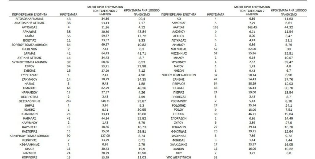 Στην Αττική καταγράφονται 332 νέα κρούσματα, στη Θεσσαλονίκη 265 και στη Λάρισα 126.