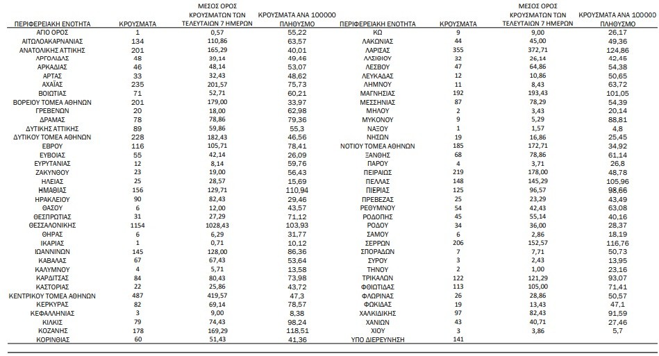Τα 1.629 κρούσματα εντοπίστηκαν στην Αττική, 1.154 στη Θεσσαλονίκη και 355 στη Λάρισα.