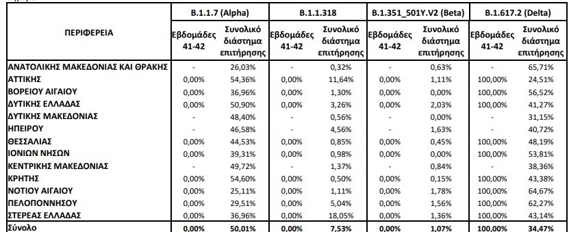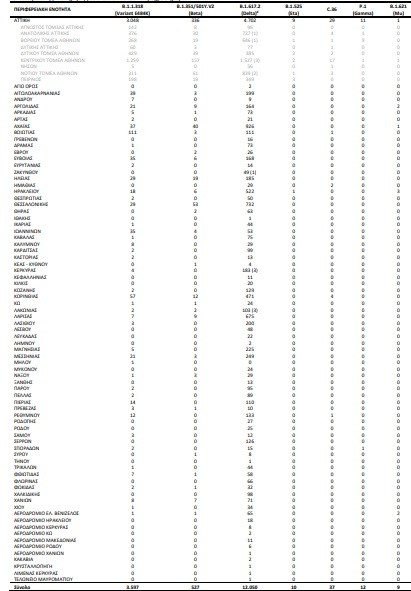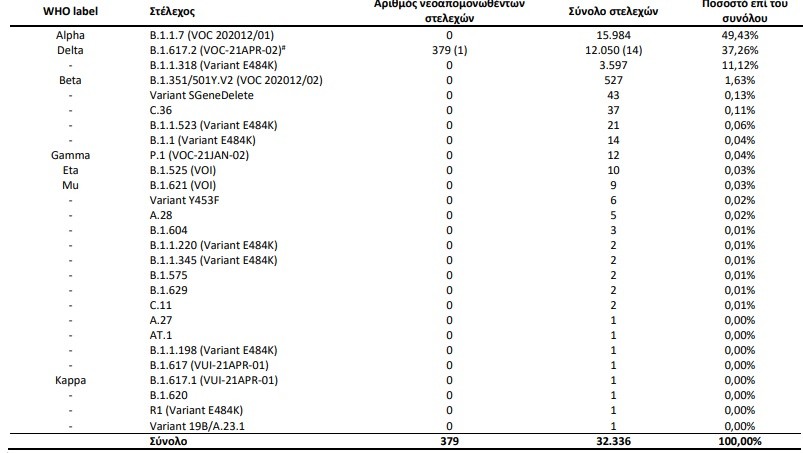 Από τα δείγματα αυτά, 38,48% αφορούν στο B.1.1.318 (Variant E484K), 34,55% στο Delta, 15,83% στο Alpha, 5,93% στο Beta, 0,12% στο C.36, 0,09% στο Gamma, 0,09% στο Eta και 0,09% στο A.28.
