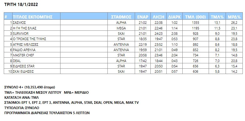 Όμως τα δελτία των δύο σταθμών πλασαρίστηκαν στις θέσεις 9 και 10 και πάντως πηγαίνουν καλύτερα από τις ειδήσεις του Alpha αλλά και του Mega, τα οποία, ας μην ξεχνούμε, οι σταθμοί τους έχουν επιλέξει διαφορετική ώρα μετάδοσης από αυτή των άλλων- ιδιωτικών- καναλιών.