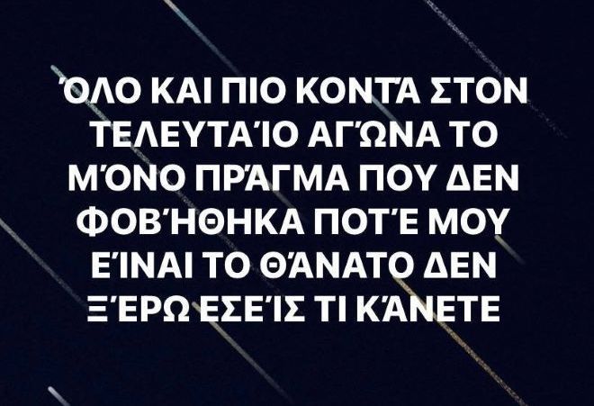 «Όλο και πιο κοντά στον τελευταίο αγώνα. Το μόνο πράγμα που δεν φοβήθηκα ποτέ μου είναι τον θάνατο. Δεν ξέρω εσείς τι κάνετε», φαίνεται να έγραψε ο άνδρας στο Facebook.