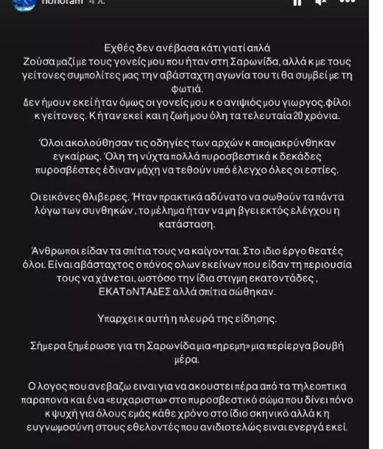 «Σήμερα ξημέρωσε για τη Σαρωνίδα μία «ήρεμη», μία περίεργα βουβή μέρα. Ο λόγος που ανεβάζω είναι για να ακουστεί πέρα από τα τηλεοπτικά παράπονα και ένα «ευχαριστώ» στο Πυροσβεστικό Σώμα που δίνει πόνο και ψυχή για όλους εμάς κάθε χρόνο στο ίδιο σκηνικό αλλά και η ευγνωμοσύνη στους εθελοντές, που ανιδιοτελώς είναι ενεργά εκεί», καταλήγει στην ανάρτησή της η Ελεονώρα Μελέτη.