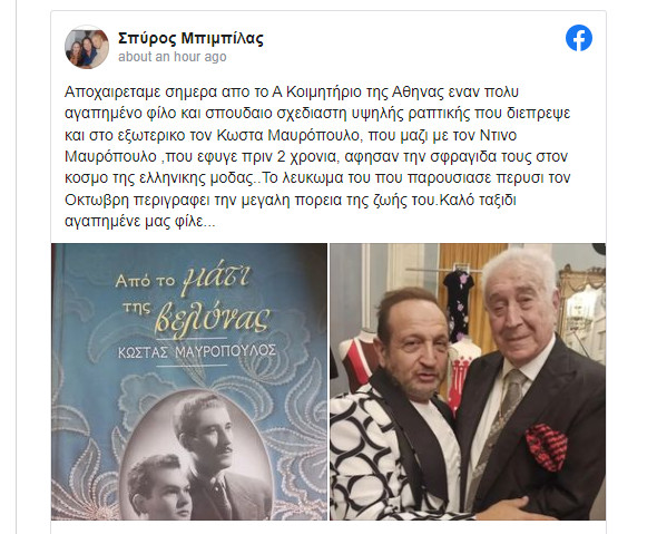 Συγκεκριμένα ο Σπύρος Μπιμπίλας ανέβασε μία κοινή τους φωτογραφία και το εξώφυλλο του βιβλίου του Κώστα Μαυρόπουλου «Από το μάτι της βελόνας» και έγραψε στη λεζάντα: «Αποχαιρετάμε σήμερα από το Ά Κοιμητήριο της Αθήνας έναν πολύ αγαπημένο φίλο και σπουδαίο σχεδιαστή υψηλής ραπτικής που διέπρεψε και στο εξωτερικό τον Κώστα Μαυρόπουλο, που μαζί με τον Ντίνο Μαυρόπουλο, που έφυγε πριν 2 χρόνια, άφησαν την σφραγίδα τους στον κόσμο της ελληνικής μόδας… Το λεύκωμα του που παρουσίασε πέρυσι τον Οκτώβρη περιγράφει την μεγάλη πορεία της ζωής του. Καλό ταξίδι αγαπημένε μας φίλε…».
