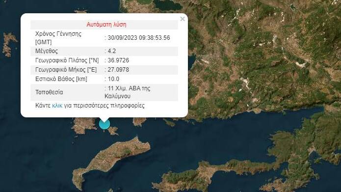 Ισχυρή σεισμική δόνηση μεγέθους 4,2 βαθμών της κλίμακας Ρίχτερ σημειώθηκε στην Κάλυμνο...το μεσημέρι του Σαββάτου.