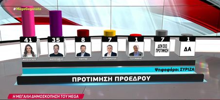 -Στο σύνολο του δείγματος, που περιλαμβάνει και τους ψηφοφόρους των άλλων κομμάτων, η Έφη Αχτσιόγλου έχει σαφές προβάδισμα με 35% έναντι 19% του Στέφανου Κασσελάκη και 12% του Ευκλείδη Τσακαλώτου, ενώ ακολουθούν ο Νίκος Παππάς με 4% και ο Στέφανος Τζουμάκας με 3%.