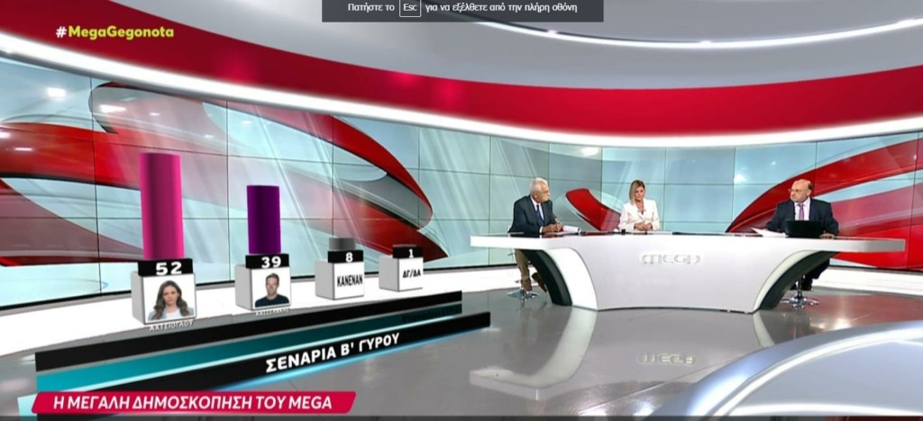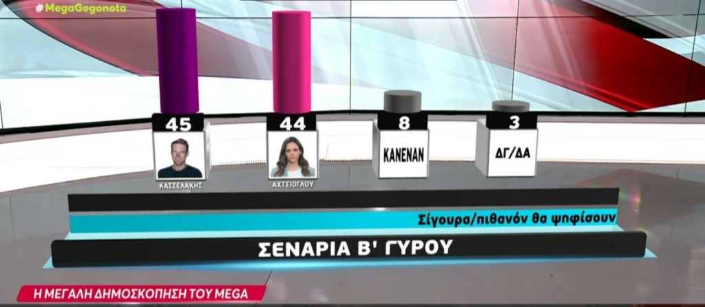 Έκπληξη αποτελεί το γεγονός ότι σε εκείνους που δηλώνουν πως θα πάνε να ψηφίσουν στις εκλογές την Κυριακή προηγείται ο Στέφανος Κασσελάκης με 8 μονάδες δηλαδή με 39% έναντι 31% που συγκεντρώνει η Έφη Αχτσιόγλου. Στο ερώτημα για τον δεύτερο γύρο ο οποίος είναι πολύ πιθανό να διεξαχθεί και πάλι ο Στέφανος Κασσελάκης καταγράφει ένα οριακό προβάδισμα σε εκείνους που δηλώνουν ότι θα πάνε να ψηφίσουν με 45% έναντι 44% της Έφης Αχτσιόγλου.