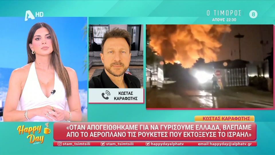 «Καταφέραμε να βρούμε έναν τρόπο να φύγουμε οδικώς για την Ιορδανία. Φτάσαμε στο Αμάν μετά από μεγάλη ταλαιπωρία και από εκεί είχαμε κλείσει μια πτήση για Αθήνα. Στον δρόμο μας ενημέρωσαν ότι ακυρώθηκε και αυτή η πτήση, εγώ όμως ήμουν καλύτερα ψυχολογικά γιατί είχα φύγει από το Τελ Αβίβ. Την επόμενη ημέρα βρήκα μια πτήση για Κύπρο και έτσι καταφέραμε να γυρίσουμε. Ήθελα απλά να φύγω από τη Μέση Ανατολή. Όταν επιβιβαστήκαμε στο αεροπλάνο είδαμε από το παράθυρο όλες τις ρουκέτες που φύγανε από το Ισραήλ για το Ιράν», πρόσθεσε όντας ασφαλής πλέον στην Ελλάδα.