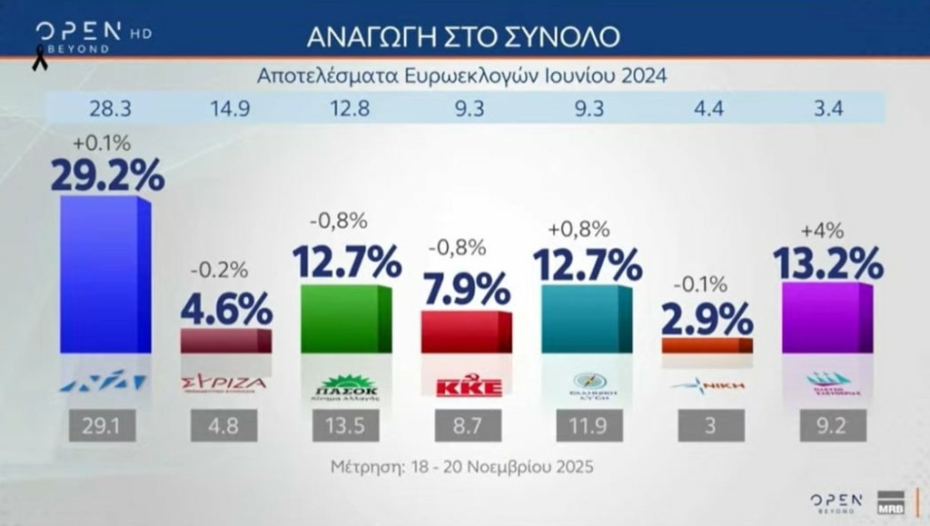 Στην αναγωγή, η ΝΔ είναι στο 29,2%, η Πλεύση Ελευθερίας 13,2%, το ΠΑΣΟΚ 12,7%, η Ελληνική Λύση 12,7%, το ΚΚΕ 7,9%, ο ΣΥΡΙΖΑ 4,6%, η Φωνή Λογικής 3,4%, η Νίκη 2,9%, το ΜέΡΑ25 2,6%, το Κίνημα Δημοκρατίας 2,1%, η Νέα Αριστερά 1,3%, Άλλο Κόμμα 7,4%.
