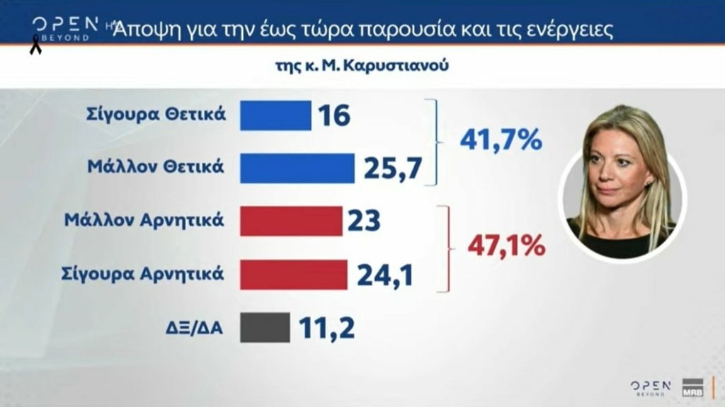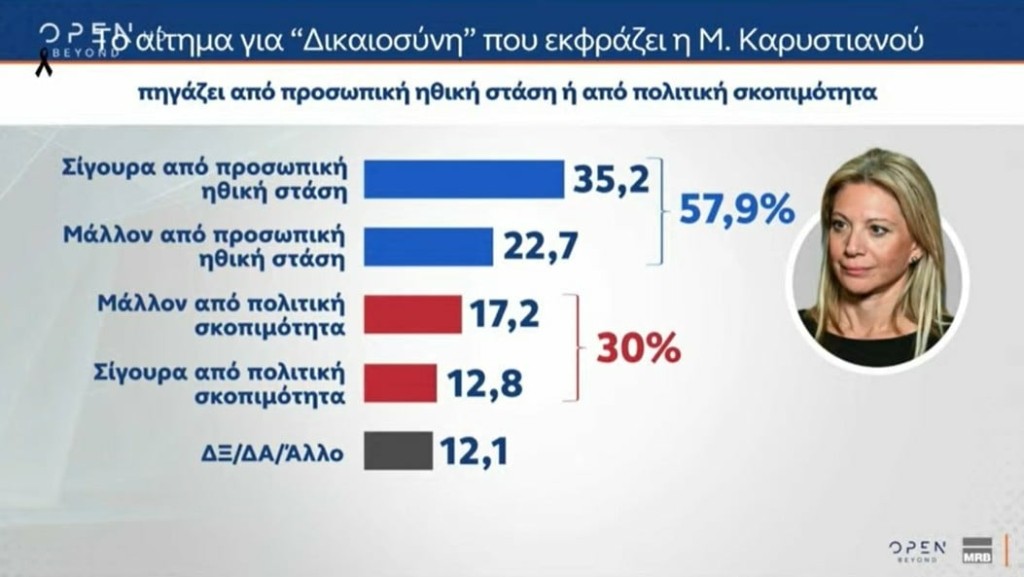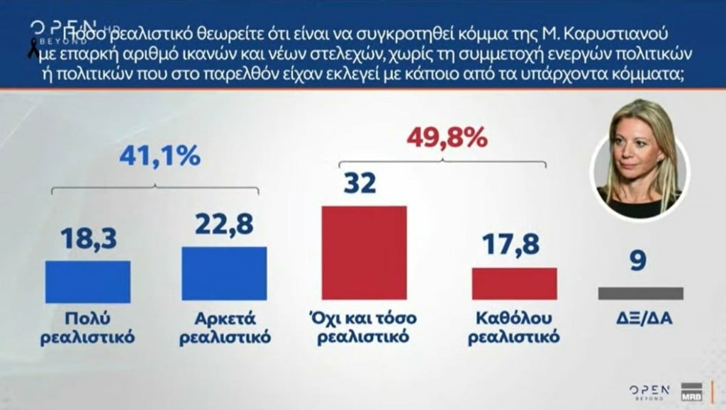 Σε ερώτηση ποιο κόμμα θεωρούν ότι μπορεί να συσπειρώσει τους ψηφοφόρους αριστερά της ΝΔ και να αποτελέσει κύριο και αξιόλογο αντίπαλο του κυβερνώντος κόμματος με πιθανότητες να κερδίσει τις εκλογές, το 30,6% απαντά «το νέο κόμμα με αρχηγό την Μ. Καρυστιανού», το 20,4% «Κανένα».