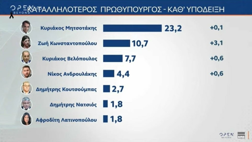 Πρωτιά του «Κανένα» καταγράφεται ξανά στο ερώτημα για τον καταλληλότερο πρωθυπουργό, με τον Κυριάκο Μητσοτάκη να ακολουθεί και στην τρίτη θέση την Ζωή Κωνσταντοπούλου.