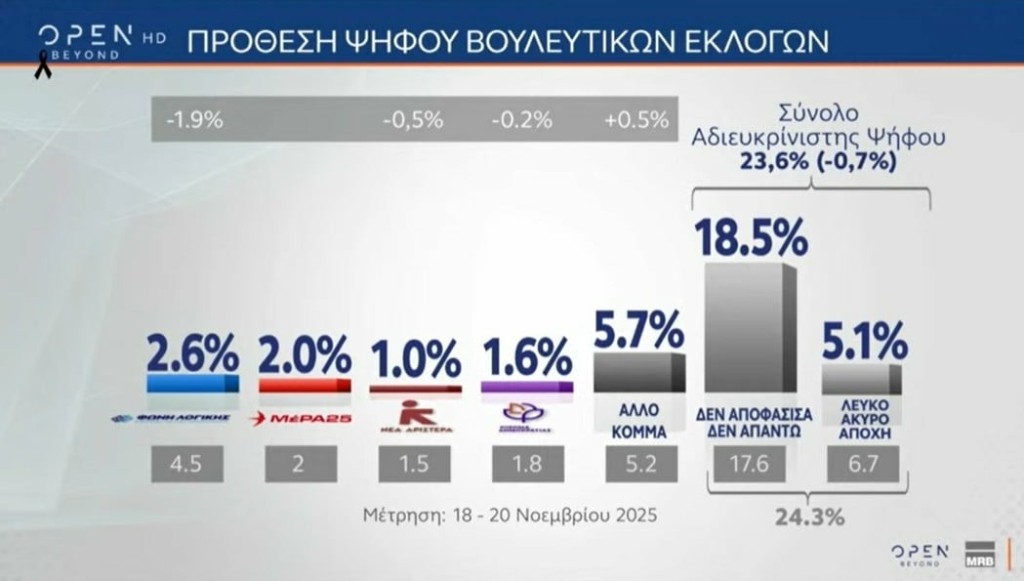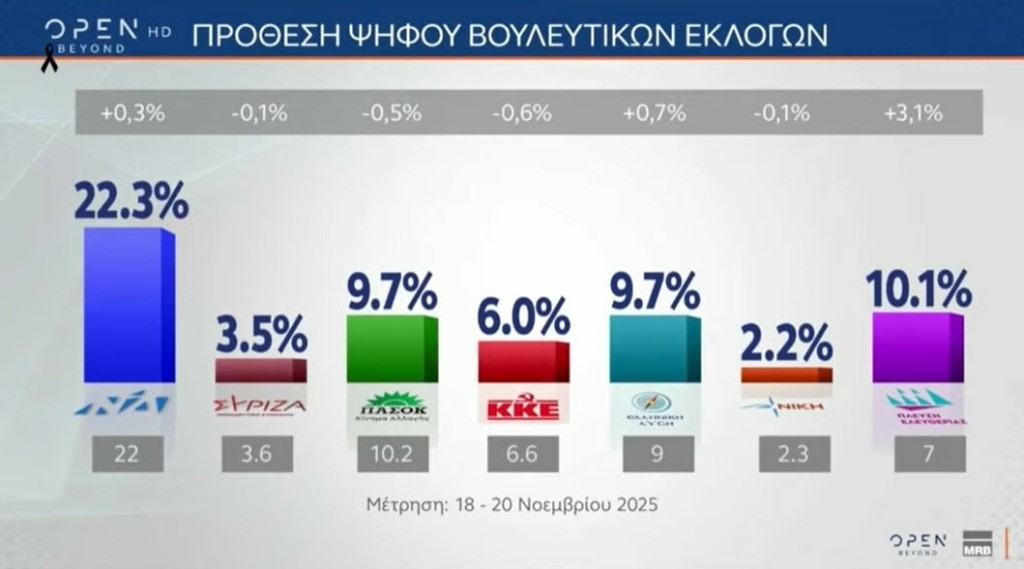Σύμφωνα με την έρευνα της MRB, για λογαριασμό του Open, στην πρόθεση ψήφου η ΝΔ είναι στο 22,3%, δεύτερη η Πλεύση Ελευθερίας 10,1%, ακολουθούν ΠΑΣΟΚ με 9,7%, Ελληνική Λύση με 9,7%, ΚΚΕ 6%, ΣΥΡΙΖΑ 3,5%, Φωνή Λογικής 2,6%, Νίκη 2,2%, ΜέΡΑ25 2%, Κίνημα Δημοκρατίας 1,6%, Νέα Αριστερά 1%, Άλλο Κόμμα 5,7%, ενώ το Σύνολο της Αδιευκρίνιστης Ψήφου είναι στο 23,6%.