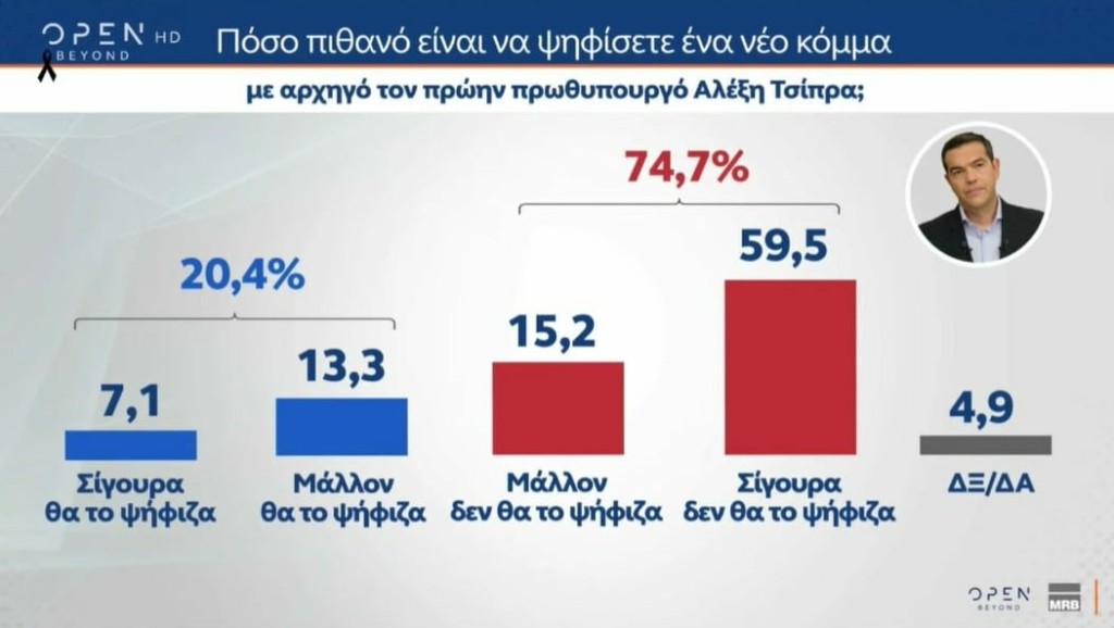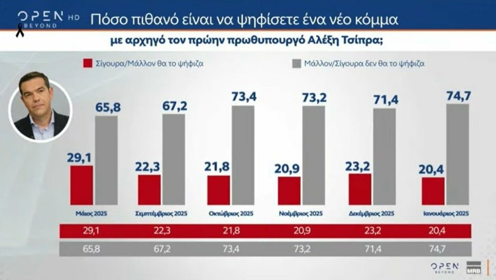Ενδιαφέρον έχουν οι απαντήσεις για την πρόθεση των πολιτών να στηρίξουν ένα κόμμα υπό τον πρώην πρωθυπουργό Αλέξη Τσίπρα. Το 20,4 % δηλώνει ότι θα το ψήφιζε, ενώ φαίνεται και η δυναmική του κόμματος από τον Μάιο του 2025 που μετράται σε δημοσκοπήσεις της MRB.
