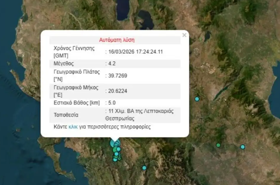 Σύμφωνα με την αυτόματη λύση του Γεωδυναμικού Ινστιτούτου, ο σεισμός είχε επίκεντρο 11 Χλμ. βορειοανατολικά της Λεπτοκαριάς Θεσπρωτίας και εστιακό βάθος 5χλμ.