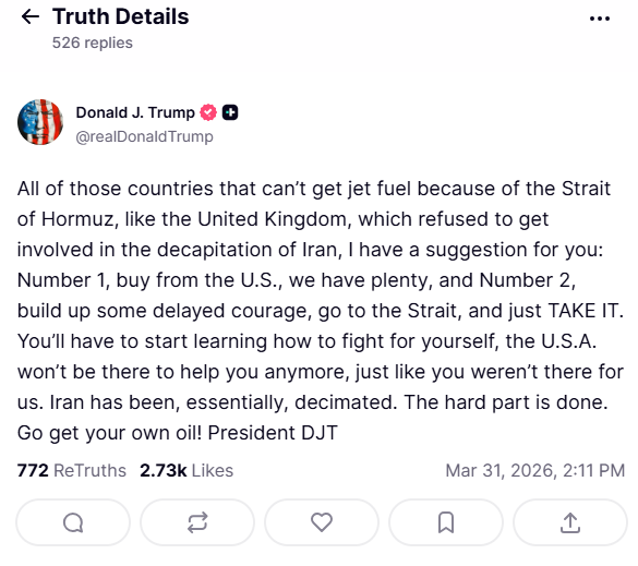 Ο Αμερικανός πρόεδρος αναφέρθηκε ειδικά στο Ηνωμένο Βασίλειο, το οποίο -όπως υποστήριξε- «αρνήθηκε να εμπλακεί» στις αμερικανικές επιχειρήσεις κατά του Ιράν. «Αγοράστε από τις ΗΠΑ, έχουμε άφθονο», ανέφερε, προτρέποντας τις χώρες να στραφούν στην αμερικανική αγορά ενέργειας.Σε ιδιαίτερα αιχμηρό τόνο, κάλεσε τους συμμάχους να επιδείξουν «καθυστερημένο θάρρος» και να μεταβούν οι ίδιοι στα Στενά του Ορμούζ για να «πάρουν το πετρέλαιο». «Πρέπει να μάθετε να πολεμάτε μόνοι σας. Οι ΗΠΑ δεν θα είναι πλέον εκεί για να σας βοηθήσουν, όπως ακριβώς δεν ήσασταν εκεί για εμάς», σημείωσε.