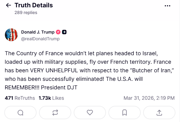 Σε άλλη ανάρτηση, «κουνάει το δάχτυλο» στη Γαλλία, η οποία «δεν βοήθησε και οι ΗΠΑ θα το θυμούνται αυτό!!!».