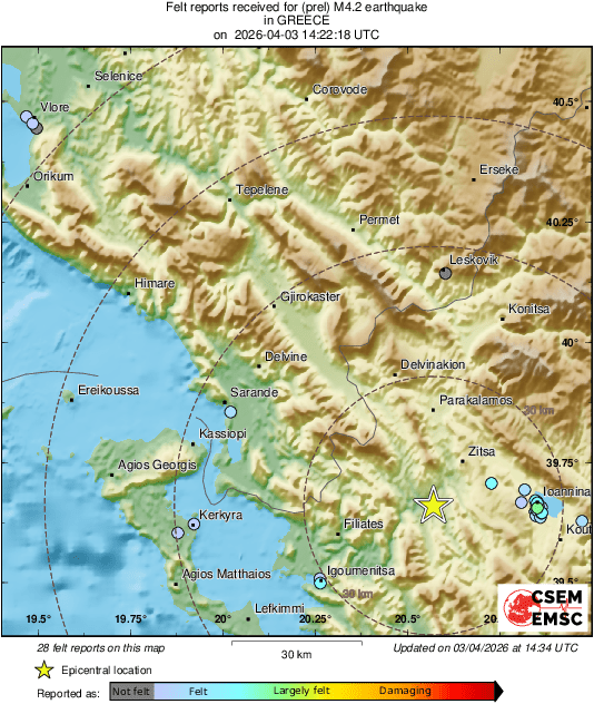 Νέα σεισμική δόνηση μεγέθους 4,2 Ρίχτερ σημειώθηκε λίγο πριν τις 17:30 απόγευμα της Παρασκευής (3/4) στη Θεσπρωτία, 12 χιλιόμετρα νοτιοανατολικά... της Λεπτοκαρυάς.