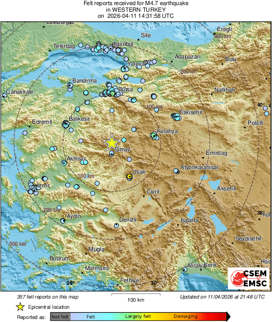 Σεισμός μεγέθους 4,7 Ρίχτερ σημειώθηκε το απόγευμα του Μεγάλου Σαββάτου (11/4) στην Τουρκία, στην επαρχία... της Κιουτάχειας.