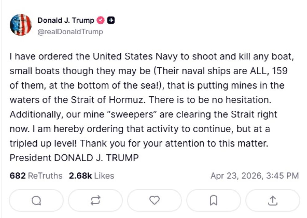 Η ανάρτησή του Τραμπ αναφέρει: «Διατάσσω το Πολεμικό Ναυτικό των Ηνωμένων Πολιτειών να καταστρέψει κάθε σκάφος, ανεξαρτήτως μεγέθους (έχουμε βυθίσει όλα τους τα 159 πλοία!), που θα τοποθετήσει νάρκες στα ύδατα του Στενού του Ορμούζ. Δεν υπάρχει χώρος για δισταγμούς. Αυτή τη στιγμή, τα ναρκαλιευτικά μας καθαρίζουν την περιοχή και διατάζω να ενταθεί η δράση τους τρεις φορές περισσότερο! Ευχαριστώ για την προσοχή σας».