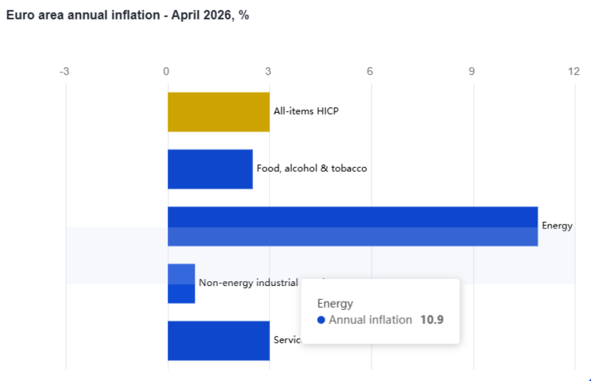 Σύμφωνα με τα ίδια στοιχεία, ο ετήσιος πληθωρισμός στην Eυρωζώνη διαμορφώθηκε σε 3% τον Απρίλιο του 2026, από 2,6% τον Μάρτιο.