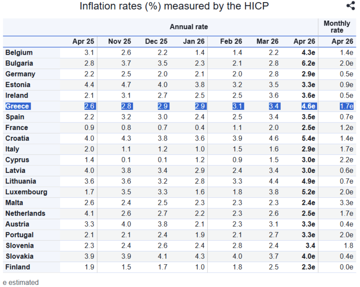 Σε 4,6% έναντι 3,4% τον Μάρτιο του 2026 και 2,6% τον Απρίλιο του 2025, ανήλθε ο ετήσιος πληθωρισμός στην Ελλάδα τον Απρίλιο... σύμφωνα με τα προσωρινά στοιχεία της Eurostat. Σε μηνιαία βάση οι τιμές καταναλωτή αυξήθηκαν κατά 1,7%.