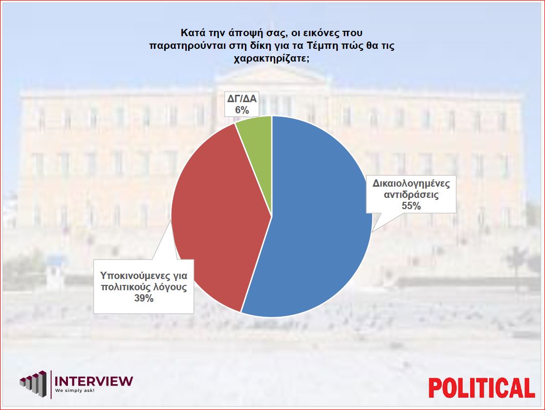 Σε επόμενη ερώτηση, «κατά την άποψή σας, τις εικόνες που παρατηρούνται στη δίκη για τα Τέμπη, πώς θα τις χαρακτηρίζατε;», το 55% απαντά «δικαιολογημένες αντιδράσεις», προφανώς σε ό,τι αφορά τους γονείς των θυμάτων, το 39% «υποκινούμενες για πολιτικούς λόγους» και το 6% ΔΓ/ΔΑ.