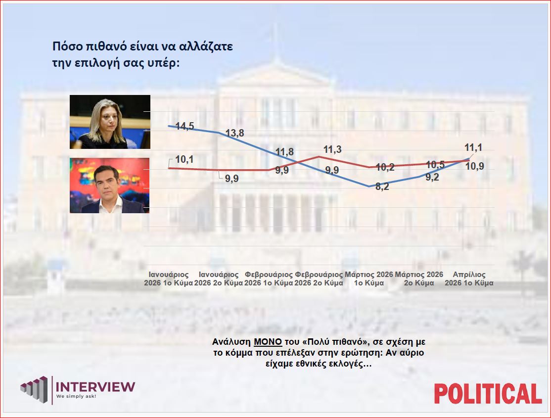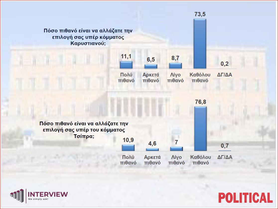 Στην ερώτηση «πόσο πιθανό είναι να αλλάζατε την επιλογή σας υπέρ ενός κόμματος Τσίπρα;», το 10,9% απαντά πολύ πιθανό, το 4,6% αρκετά πιθανό, το 7% λίγο πιθανό, το 76,8% καθόλου πιθανό και το 0,7% ΔΓ/ΔΑ. Να σημειωθεί ότι η δημοσκόπηση μέτρησε και τον απόηχο της πρόσφατης συνέντευξης του Αλέξη Τσίπρα στον ΑΝΤ1 και τον Νίκο Χατζηνικολάου.