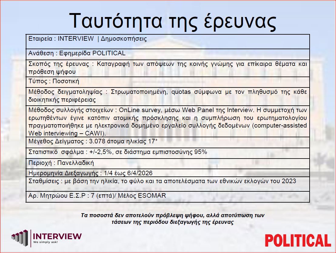 Ειδικότερα, στη δημοσκόπηση, η οποία διενεργήθηκε το διάστημα από 1/4/2026 έως 6/4/2026 και στην ερώτηση «αν είχαμε εκλογές την επόμενη Κυριακή, ποιο κόμμα θα ψηφίζατε;», το 26,4% απαντά τη ΝΔ, το 14,2% το ΠΑΣΟΚ, το 5,6% την Ελληνική Λύση, το 5,1% το ΚΚΕ, το 4,7% την Πλεύση Ελευθερίας, το3,5% το ΜέΡΑ25, το 3,5% τη Φωνή Λογικής, το 3% τον ΣΥΡΙΖΑ, το 2,4% τους Δημοκράτες, το 1% τη Νέα Αριστερά, το 1% τη Νίκη, το 10,1% άλλο και το 19,5% «δεν έχω αποφασίσει».