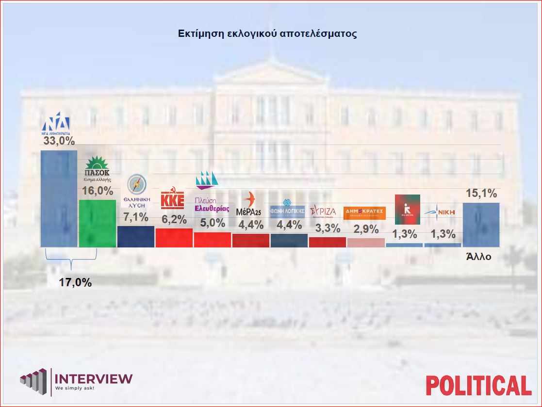 Στην εκτίμηση εκλογικού αποτελέσματος, η ΝΔ καταγράφει ποσοστό της τάξεως του 33%, το ΠΑΣΟΚ 16%, με τη διαφορά τους στις 17 ποσοστιαίες μονάδες, η Ελληνική Λύση 7,1%, το ΚΚΕ 6,2%, η Πλεύση Ελευθερίας 5%, το ΜέΡΑ25 4,4%, η Φωνή Λογικής 4,4%, ο ΣΥΡΙΖΑ 3,3%, οι Δημοκράτες 2,9%, η Νέα Αριστερά 1,3%, η Νίκη 1,3%, ενώ άλλο απαντά το 15,1%.