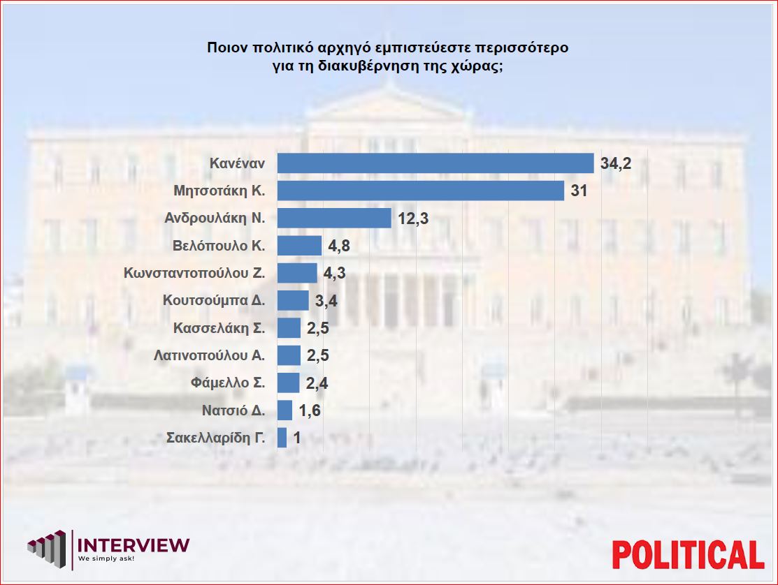 Στην ερώτηση «ποιον πολιτικό αρχηγό εμπιστεύεστε περισσότερο για τη διακυβέρνηση της χώρας;», το 34,2% απαντά «κανέναν» και ακολουθεί ο πρωθυπουργός Κυριάκος Μητσοτάκης με 31%, σχεδόν 20 μονάδες πάνω από τον Νίκο Ανδρουλάκη που συγκεντρώνει 12,3%. Ακολουθούν ο Κυριάκος Βελόπουλος με 4,8%, η Ζωή Κωνσταντοπούλου με 4,3%, ο Δημήτρης Κουτσούμπας με 3,4%, ο Στέφανος Κασσελάκης με 2,5%, η Αφροδίτη Λατινοπούλου με 2,5%, ο Σωκράτης Φάμελλος με 2,4%, ο Δημήτρης Νατσιός με 1,6% και ο Γαβριήλ Σακελλαρίδης με 1%.