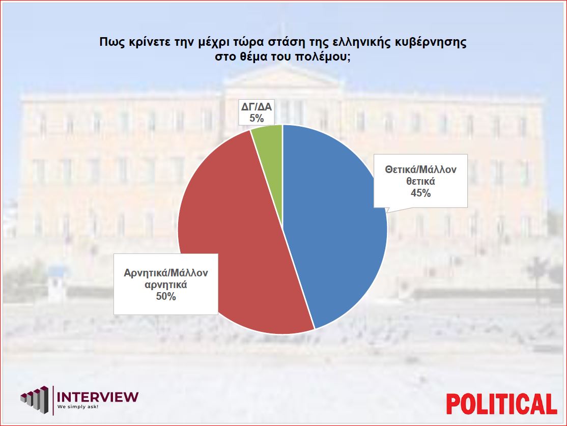 Στην ερώτηση «πώς κρίνετε τη μέχρι τώρα στάση της ελληνικής κυβέρνησης στο θέμα του πολέμου;», φαίνεται ότι πλέον οι οικονομικές επιπτώσεις των συρράξεων στη Μέση Ανατολή επηρεάζουν τους πολίτες περισσότερο από ό,τι οι κινήσεις στο πεδίο της εξωτερικής πολιτικής και άμυνας. Συγκεκριμένα, θετικά/μάλλον θετικά απαντά το 45%, αρνητικά/μάλλον αρνητικά το 50% και ΔΞ/ΔΑ το 5%.