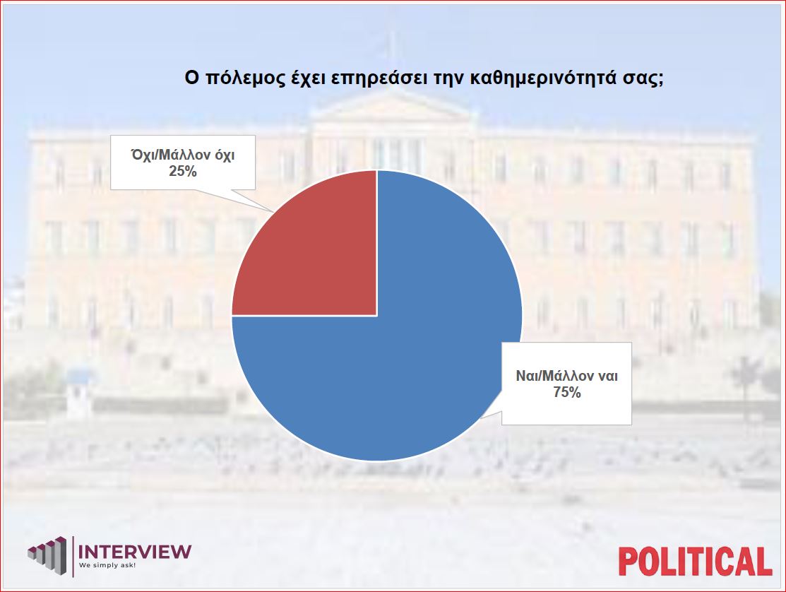 Η παραπάνω εικόνα προκύπτει, άλλωστε, ανάγλυφα από την επόμενη ερώτηση, «ο πόλεμος έχει επηρεάσει την καθημερινότητά σας;», με το 75% να απαντά ναι/μάλλον ναι και το 25% όχι/μάλλον όχι.