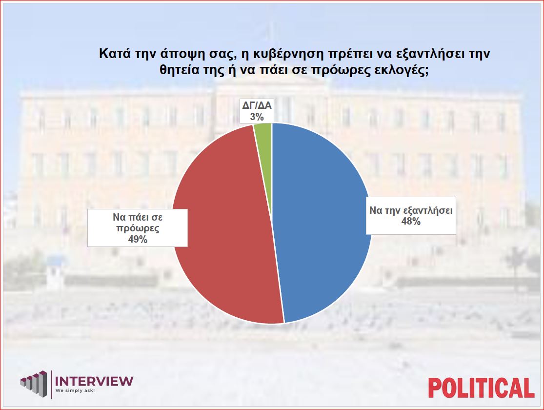 Στην επόμενη ερώτηση, «κατά την άποψή σας η κυβέρνηση πρέπει να εξαντλήσει τη θητεία της ή να πάει σε πρόωρες εκλογές;», το 48% απαντά να την εξαντλήσει, το 49% να πάει σε πρόωρες κάλπες και ΔΞ/ΔΑ το 3%.