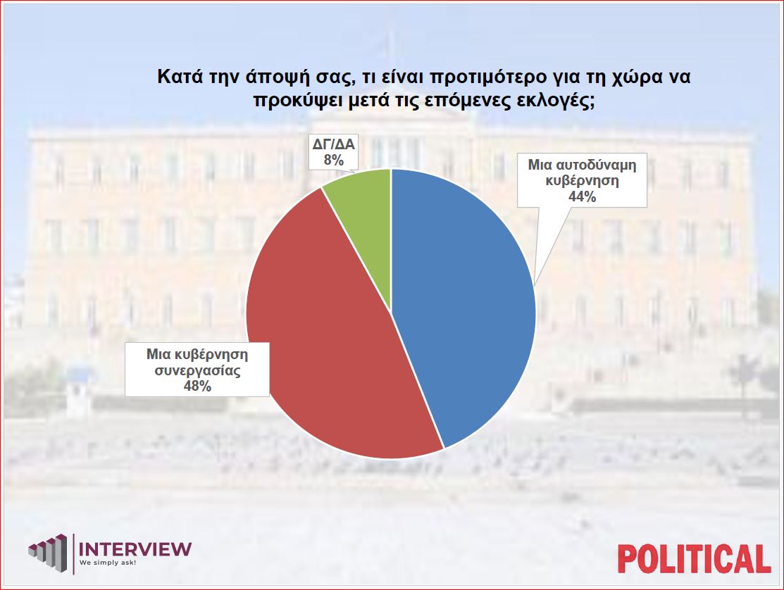 Στην ερώτηση «κατά την άποψή σας, τι είναι προτιμότερο για τη χώρα να προκύψει μετά τις επόμενες εκλογές;», το 44% απαντά μια αυτοδύναμη κυβέρνηση, το 48% μια κυβέρνηση συνεργασίας και ΔΞ/ΔΑ το 8%. Αν και λίγο μικρότερο το ποσοστό των πολιτών που επιθυμούν αυτοδύναμη κυβέρνηση, κρίνεται πολιτικά ως πιο ενιαίο, σε αντίθεση με όσους τάσσονται υπέρ των συμμαχικών κυβερνήσεων, που αποτελούν άθροισμα ψηφοφόρων διαφορετικών πολιτικών δυνάμεων, οι οποίες δεν έχουν ενιαία στάση για το ποια κόμματα θα μπορούσαν να τη συγκροτήσουν.