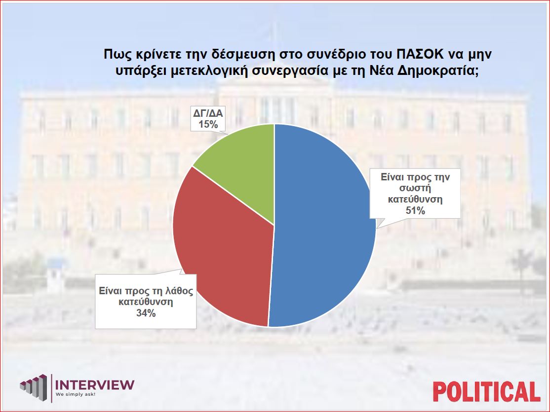 Σε άλλη ερώτηση «πώς κρίνετε τη δέσμευση στο συνέδριο του ΠΑΣΟΚ να μην υπάρξει μετεκλογική συνεργασία με τη ΝΔ;», το 51% απαντά πως είναι στη σωστή κατεύθυνση, το 34% πως είναι στη λάθος κατεύθυνση και ΔΞ/ΔΑ το 15%.