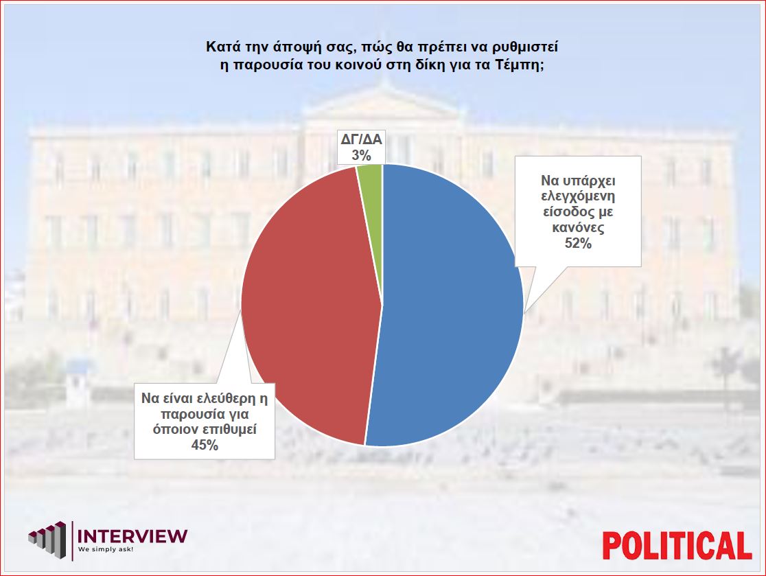 Στη δημοσκόπηση υπάρχουν ερωτήματα σχετικά με τη δίκη που έχει ξεκινήσει για τα Τέμπη. Συγκεκριμένα, στο ερώτημα «κατά την άποψή σας πώς θα πρέπει να ρυθμιστεί η παρουσία του κοινού στη δίκη για τα Τέμπη;», το 52% τάσσεται υπέρ της ελεγχόμενης εισόδου με κανόνες, το 45% απαντά να είναι ελεύθερη η παρουσία για όποιον επιθυμεί και το 3% ΔΓ/ΔΑ.
